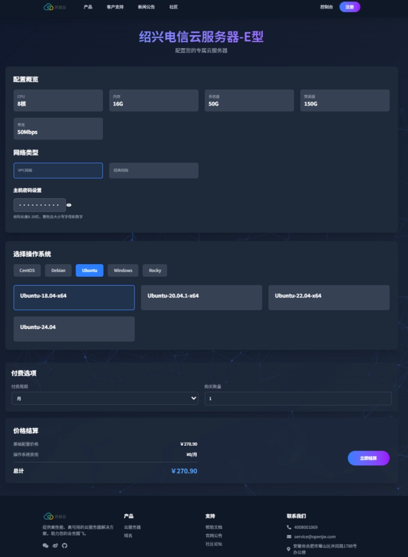 这是一款专为智简魔方V10业务管理系统设计的“开放云”主题模板。该模板由专业团队匠心打造,采用极简主义设计风格,摒弃了冗余的页面元素,将核心视觉聚焦于云服务器销售功能。其最大的亮点在于具备出色的多端适配能力,无论是PC端还是移动端,均能呈现出优雅且一致的用户界面。