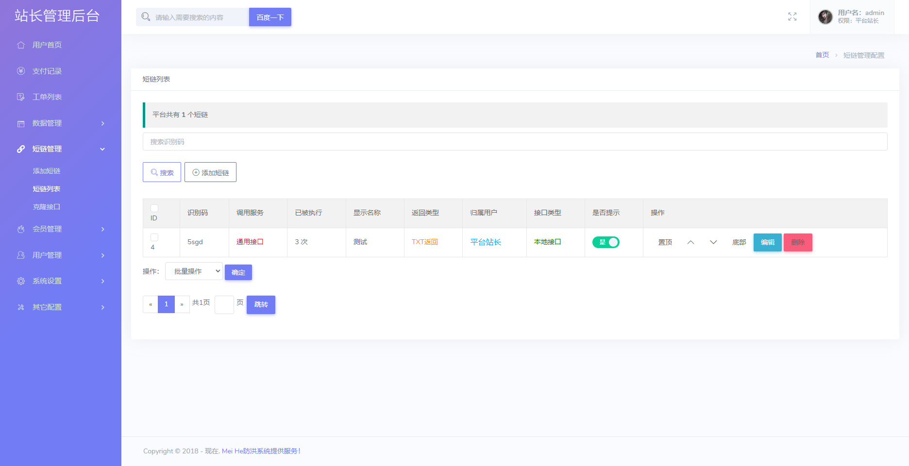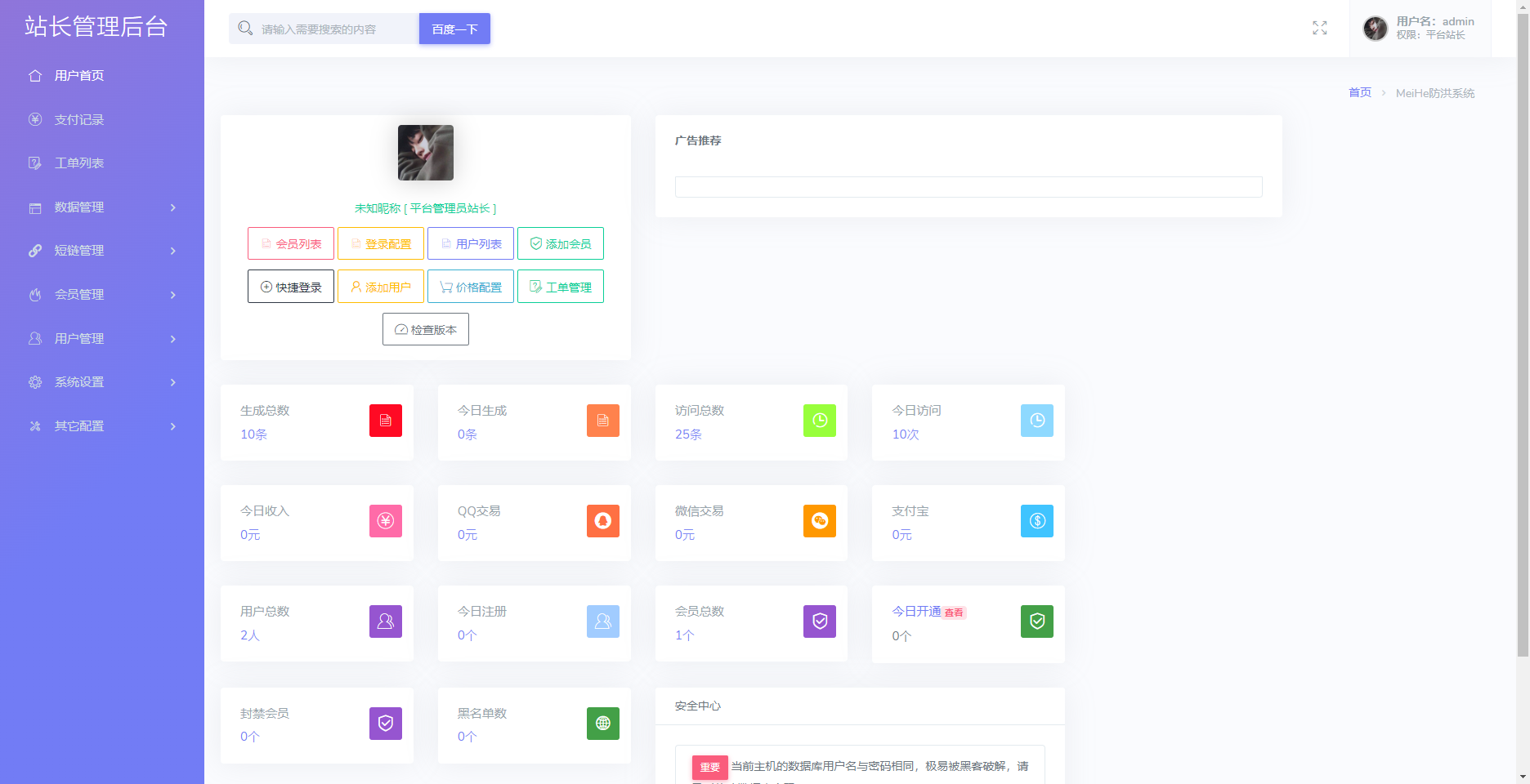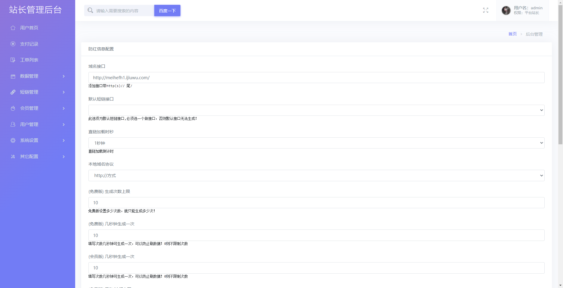一款不错的防红源码,支持直链/跳转/短链接,使用本系统红了的域名可在微信和QQ直接打开,系统带访问记录列表,可查看访问者ip和访问方式,带会员和支付功能 系统使用的是PHP语言,支付对接的是易支付 防红接口可用自己的域名做接口,也可以同系统对接,接口域名可设置普通用户或会员才可使用 苹果系统跳转浏览器会提示链接不存在,其他功能正常 v2.2版本更新项目 1.修复注册邮箱发送不了问题 2.修复频繁生成检测Bug 3.新增动态次数效果 4.新增用户独立生成统计 5.新增续费更换域名自动获取 6.修复支付不回调问题 7修复工单回复不了问题 8.取消前台开通会员 9.修复生成域名重复问题 10.修复已知BUG 11.新增未知BUG 12新增彩虹代码