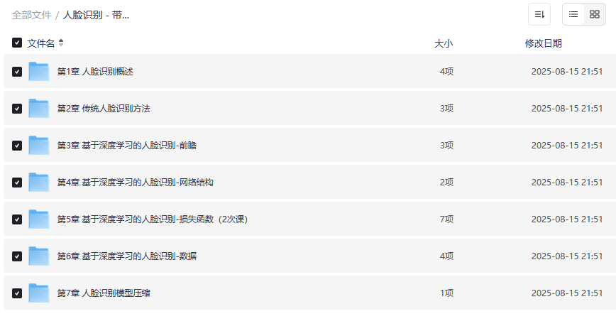 主要内容 核心课程模块 基础理论篇: 人脸识别概述与发展历程 传统识别方法流程详解 特征提取与分类器原理 深度学习实战: 卷积神经网络基础 主流网络结构解析 损失函数优化技巧(Margin-Softmax等) 度量学习方法实践 工程实践篇: 数据处理与环境配置 模型压缩技术 长尾分布问题解决方案 完整系统搭建指南 特色内容 早期深度学习算法解析 噪声数据处理方法 测试协议与评估标准 实战项目源码与课件