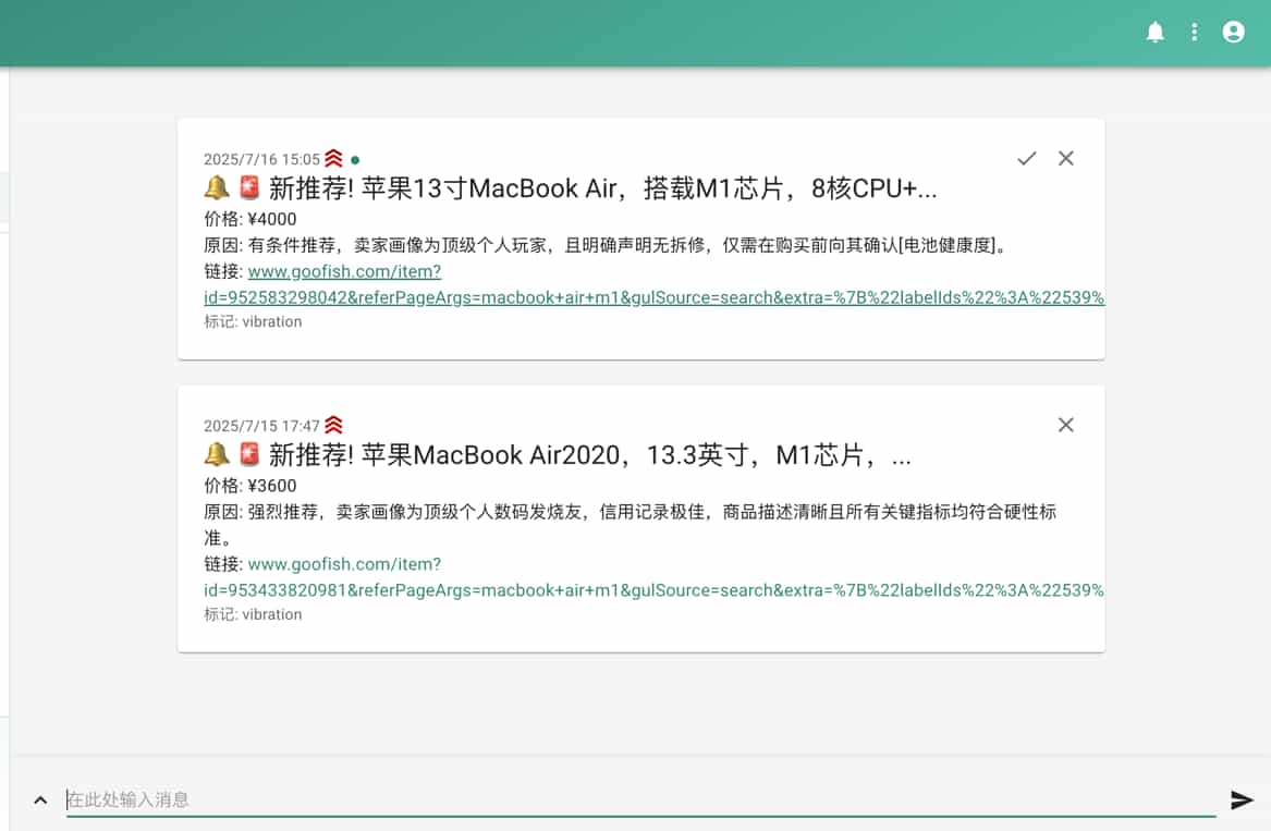可视化Web界面: 提供完整的Web UI,支持任务的可视化管理、AI标准在线编辑、运行日志实时查看和结果筛选浏览,无需直接操作命令行和配置文件。 AI驱动的任务创建: 只需用自然语言描述你的购买需求,即可一键创建包含复杂筛选逻辑的全新监控任务。 多任务并发: 通过 config.json 同时监控多个关键词,各任务独立运行,互不干扰。 实时流式处理: 发现新商品后,立即进入分析流程,告别批处理延迟。 深度AI分析: 集成多模态大语言模型(如 GPT-4o),结合商品图文和卖家画像进行深度分析,精准筛选。 高度可定制: 每个监控任务均可配置独立的关键词、价格范围、筛选条件和AI分析指令 (Prompt)。 即时通知: 支持通过 ntfy.sh、企业微信机器人和 Bark,将符合AI推荐的商品立即推送到你的手机或桌面。 定时任务调度: 支持 Cron 表达式,可为每个任务设置独立的定时执行计划。 Docker 一键部署: 提供 docker-compose 配置,实现快速、标准化的容器化部署。 健壮的反爬策略: 模拟真人操作,包含多种随机延迟和用户行为,提高稳定性。