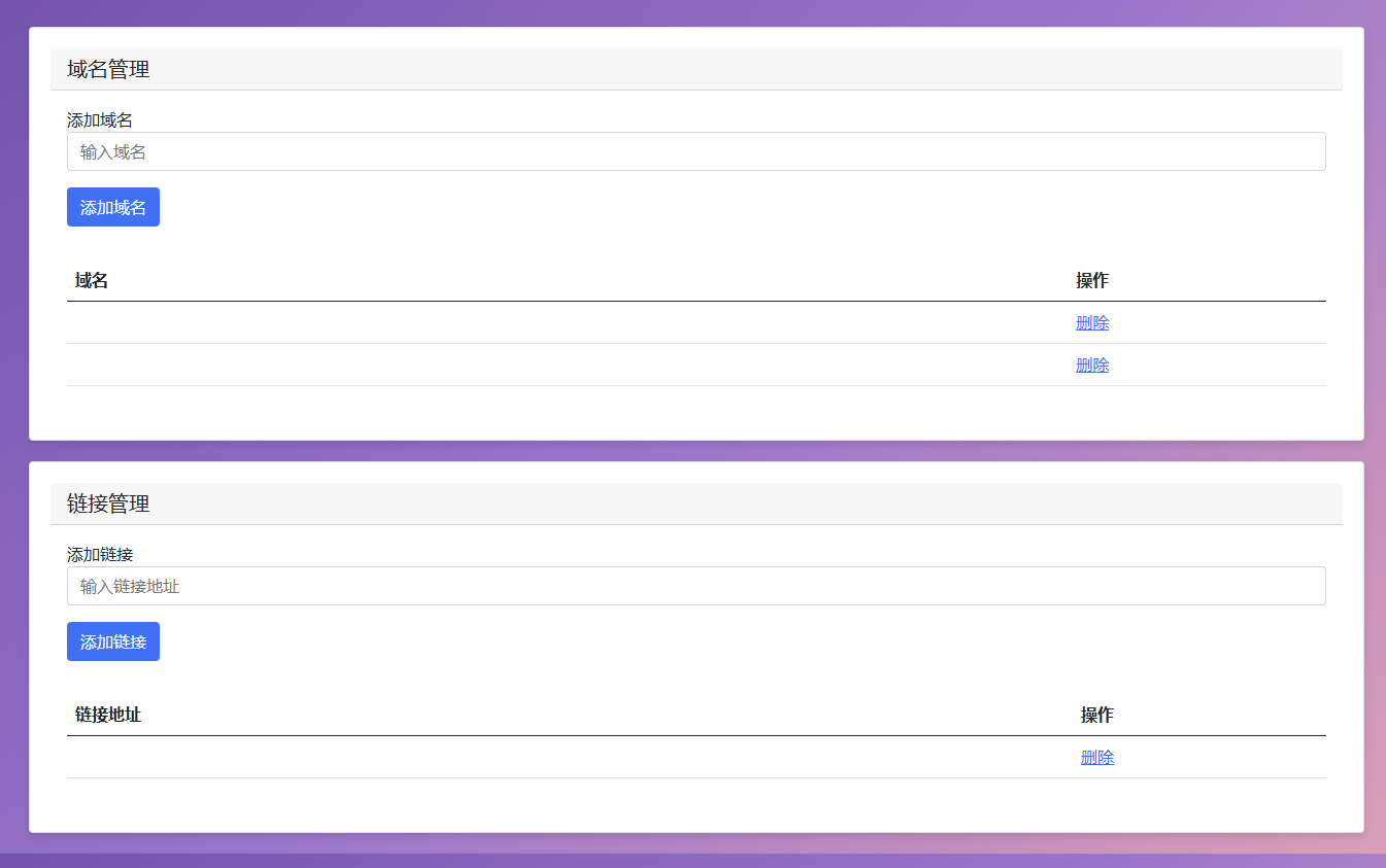 使用本源码后,跳转的逻辑就是用户访问a.com,随机跳转到b.com或者c.com,b和 c再随机跳转到产品链接,也就是跳转2次,且都是随机跳转,这样a.com被屏蔽的概率就极大的降低了,因为第一次跳转的是b和c,都是我们准备的干净域名,没有任何可能的违规内容,如果被举报,因为大部分平台都是机器检测,被检测到的概率也被极大的降低 同理如果我们推 b.com也会先跳a或c,推c.com就先跳 a或 b,也就是说我们可以同时推a、b、c三个域名,就算其中有一个被屏蔽,因为是随机跳转,也会有一定几率正常跳转,保证推广效果! 测试环境:MySQL5.6,PHP7.2 中转域名和需要跳转显示的域名在后台添加,如果是在微信推广,中转还有跳转显示的域名都不能红,红了就打不开 教程: 系统环境:MySQL5.6-5.7,PHP7.2(用其他的版本也可以) 1.上传源码到根目录解压 2.导入数据库 3.修改config.php文件里面的数据库配置信息 后台:域名/admin.php 访问直接可以设置,无后台账号密码 域名管理:添加你的中转域名 链接管理:添加需要跳转显示的域名